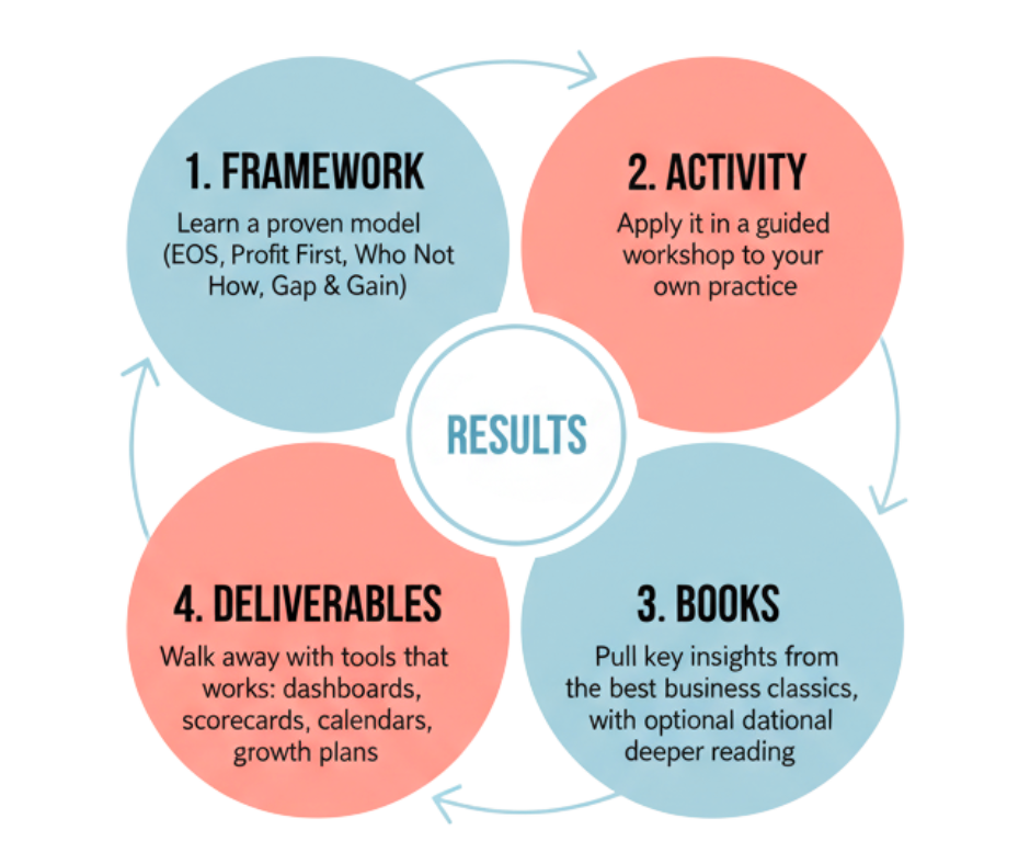 - Framework – Learn a proven model (EOS, Profit First, Who Not How, Gap & Gain).